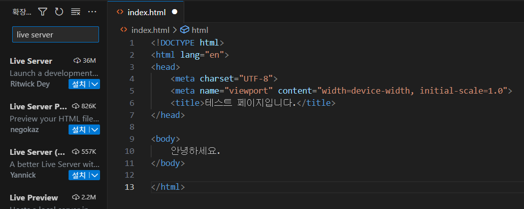 이 방법 말고, live server라는 확장팩을 설치하여 실시간으로 html 파일의 코딩 상황을 확인해볼 수 있습니다.